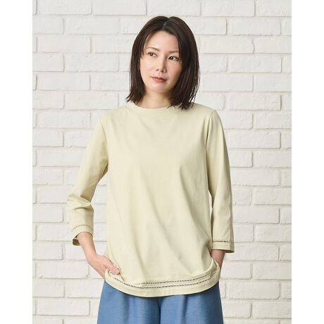 すっきりとしたシルエットに袖口と裾にあしらったハシゴレースをデザインアクセントにしたさらっとした肌触りのカットソーです。