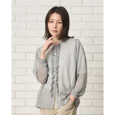繊細なフロントのフリルが装いに優雅な表情を添えるハイゲージニットカーディガン。