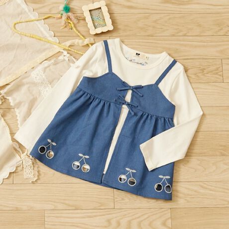 長袖カットソーに、デニムライクなキャミソールベストを重ね着したようなレイヤード風のデザイン。