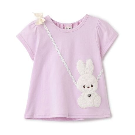ウサギのポシェットを肩から掛けているようなTシャツです。さまざまな素材を組み合わせて、個性あふれるデザインに仕上げました。程よく広がる上品なAラインシルエットなのも魅力的。後ろ衿ぐりはゴム仕様になっており、スムーズな着脱が叶います。