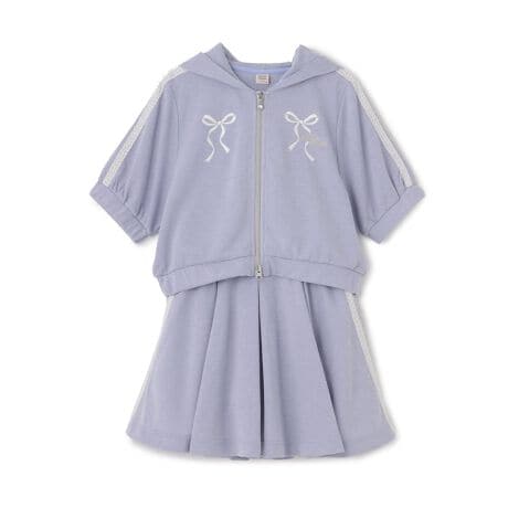 フロントのリボン刺しゅうとレースのラインがガーリースポーティな雰囲気のミニ裏毛のセットアップです。