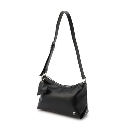 ロゴ入りのハートチャームがついているショルダーバッグです。上品な光沢感のある合皮素材で、大人っぽい雰囲気がただよいます。ショルダーベルトは長さを調節でき、斜め掛けや肩掛けも可能。内側には小物の収納に便利なポケットを備えています。≪重さ≫F/約253g