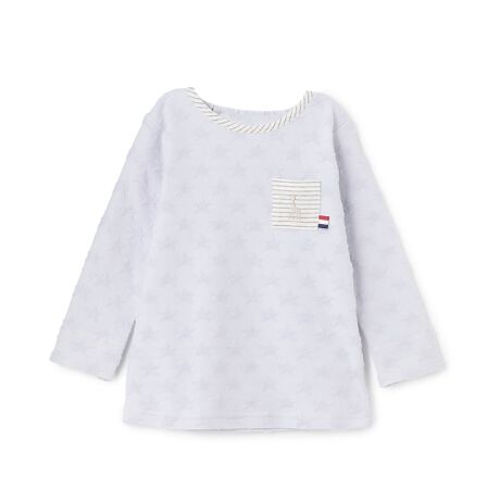 ポコポコとしたパイルの星がかわいい長袖Tシャツです。胸元のポケットにはソフィーの刺しゅうを入れました。袖口を返すとボーダー柄が現れるのもおしゃれなポイント。後ろ衿ぐりがゴム仕様になっており、簡単にお着替えできます。内側にお名前を記入できるタグつき。