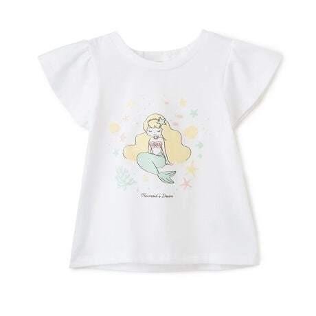 上品な佇まいのマーメイドが目を引くTシャツです。海の中をイメージしたプリントデザインで、華やかに仕上げています。バックネックはゴム入りの設計になっており、お着替えもラクラク。さまざまなボトムと相性が良く、デイリーに着回しできます。