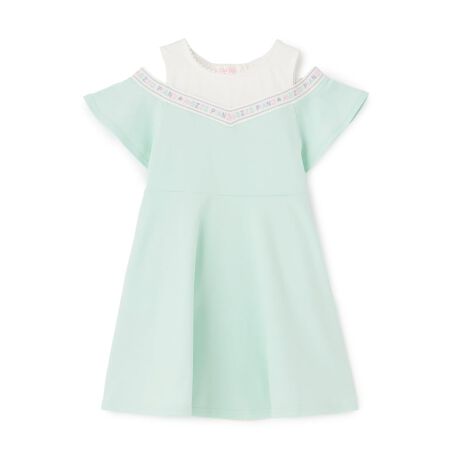 肩あきデザインが可愛いレイヤード風のドッキングワンピースです。V字になったマルチカラーのロゴテープでスポーティー感をプラス。スカート部分は女の子らしい印象を与えるフレアシルエットです。後ろ衿ぐりにゴムが入っており、スムーズな着脱が叶います。内側にお名前を記入できるタグつき。両側にポケットがついています。【おすすめの着用時期は春夏シーズン】