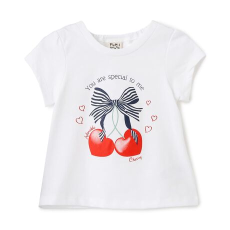 チェリーとリボンの大きなグラフィックが印象的なTシャツです。周りにちりばめたロゴとハートモチーフも可愛いポイント。ベーシックなシルエットで、お手持ちのボトムスと好相性です。バックネックにはゴムが入っており、スムーズにお着替えできます。