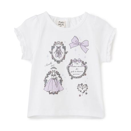 バレエモチーフのプリントデザインが魅力的なTシャツです。袖口のフリルでかわいらしい雰囲気を高めました。バックネックはスムーズなお着替えが叶うゴム入りの設計。チュールスカートやドレスシューズなどを合わせると、特別感のある華やかな装いに仕上がります。