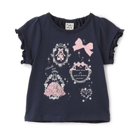 バレエモチーフのプリントデザインが魅力的なTシャツです。袖口のフリルでかわいらしい雰囲気を高めました。バックネックはスムーズなお着替えが叶うゴム入りの設計。チュールスカートやドレスシューズなどを合わせると、特別感のある華やかな装いに仕上がります。
