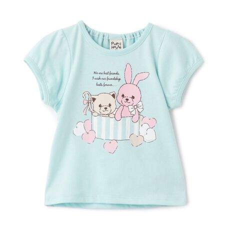 ネコとウサギがプレゼントボックスに入っている可愛いデザインのTシャツです。やわらかなパステルカラーでまとめており、女の子らしい雰囲気がただよいます。程よく丸みのあるスリーブも個性的なポイント。バックネックはお着替えしやすいゴム入りの設計です。