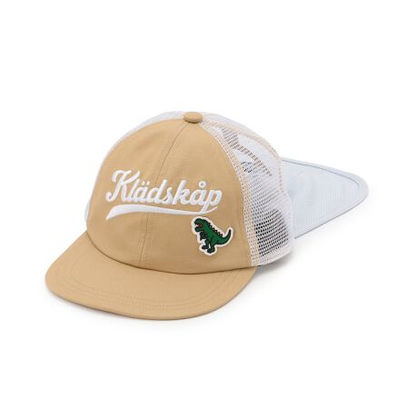 立体感のある刺しゅうと恐竜のアップリケが目を引くキャップです。後ろ側が通気性の良いメッシュになっている、頭が蒸れにくい設計。内側のスベリには接触冷感生地を使用しており、かぶり心地も快適です。日除け対策に役立つ垂れ布を備えました。調整しやすい面ファスナーのバックベルトや、落下防止に便利なあご紐もうれしいポイントです。内側にお名前を記入できるタグつき。