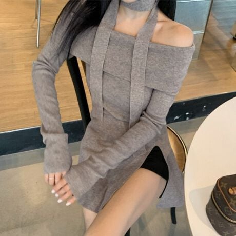 オフショルダー仕様の長袖トップスは、首元にスカーフ風のデザインが施されています。