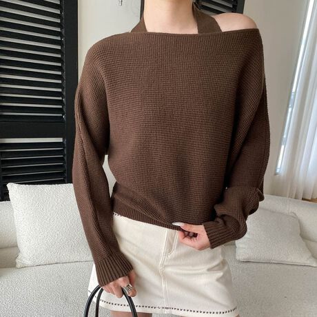 アシンメトリーなネックラインが印象的な長袖ニットトップスです。