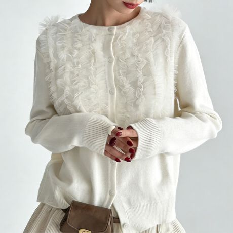 フロントに施された縦フリルが印象的な長袖カーディガンです。
