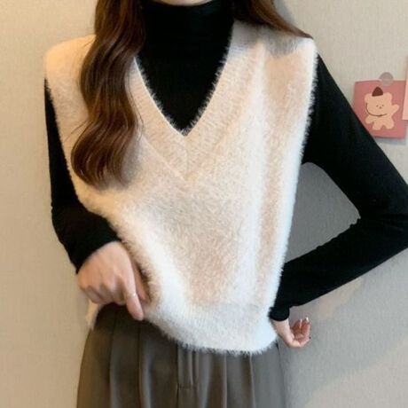 Vネック仕様で顔まわりをすっきりと見せ、インナーとのレイヤードが映えるデザイン。