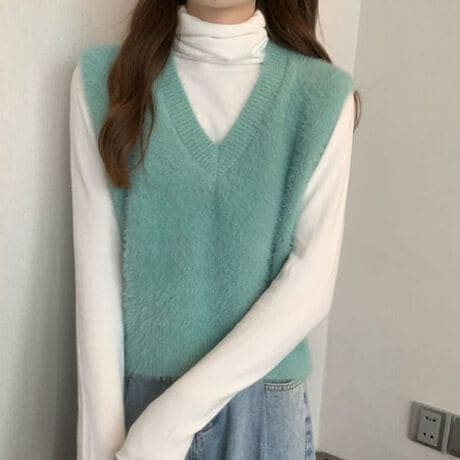Vネック仕様で顔まわりをすっきりと見せ、インナーとのレイヤードが映えるデザイン。
