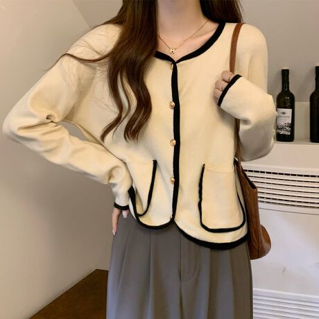 配色トリム×ゴールドボタンが映える長袖カーディガンです。