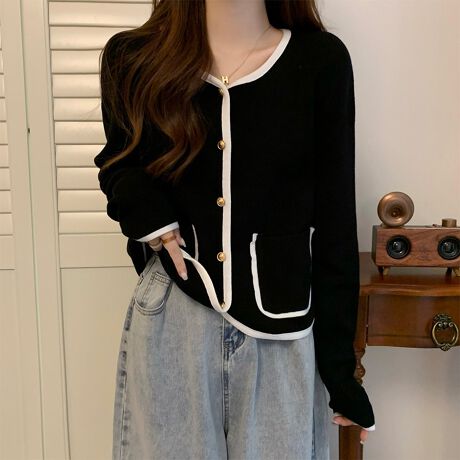 配色トリム×ゴールドボタンが映える長袖カーディガンです。