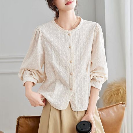 刺繍とレースが上品な印象を与える、長袖フェミニンブラウスです。