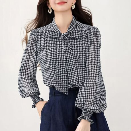 クラシカルな千鳥格子柄に、ボウタイとパフスリーブを組み合わせた華やかな長袖ブラウスです。