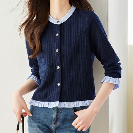 襟元と裾にフリルをあしらった配色デザインの長袖カーディガンです。