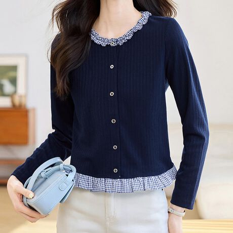 襟元と裾にフリルをあしらった配色デザインの長袖カーディガンです。