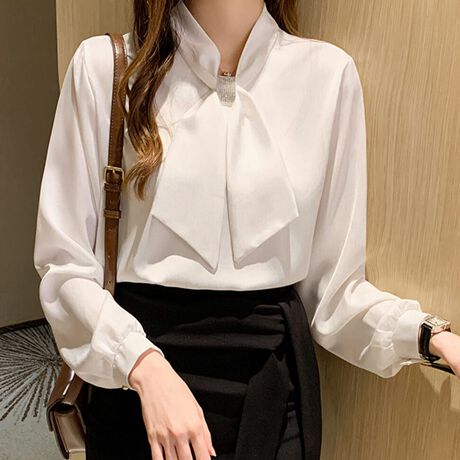 スクエアネックにボウタイをあしらった上品な長袖ブラウスです。