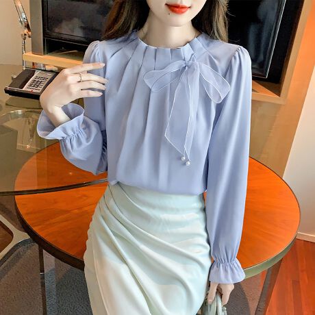 プリーツ入りのネックラインにボウタイをあしらった長袖ブラウスです。