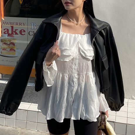 胸元にはシャーリングを施し、立体感とメリハリのあるシルエットに。