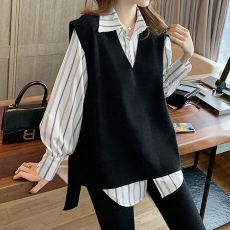 Vネックベスト×ストライプシャツレイヤードセット