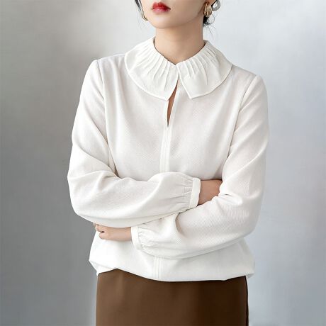 プリーツ仕様の襟が印象的な長袖ブラウスです。