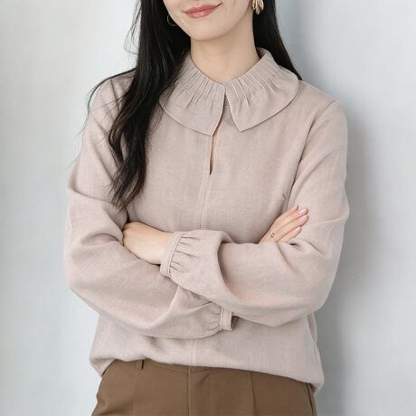 プリーツ仕様の襟が印象的な長袖ブラウスです。