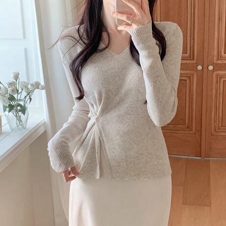 Vネックが顔まわりをすっきりと見せ、女性らしい印象に。