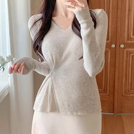 Vネックが顔まわりをすっきりと見せ、女性らしい印象に。
