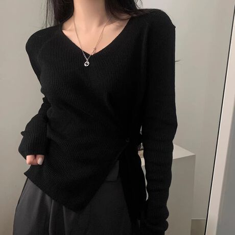 Vネックが顔まわりをすっきりと見せ、女性らしい印象に。