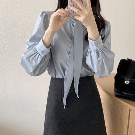 襟元にリボンタイをあしらった長袖ブラウスです。