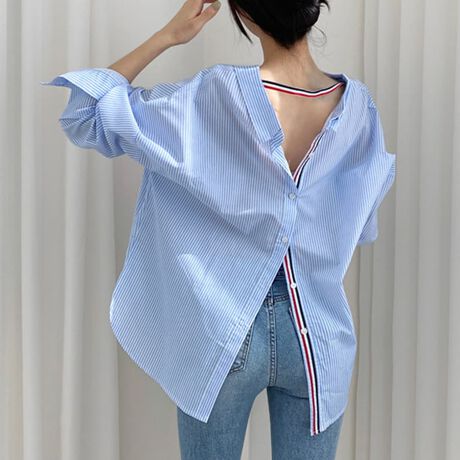 前後を逆に着用することで、バックボタンがフロントに映えるユニークなスタイルに。