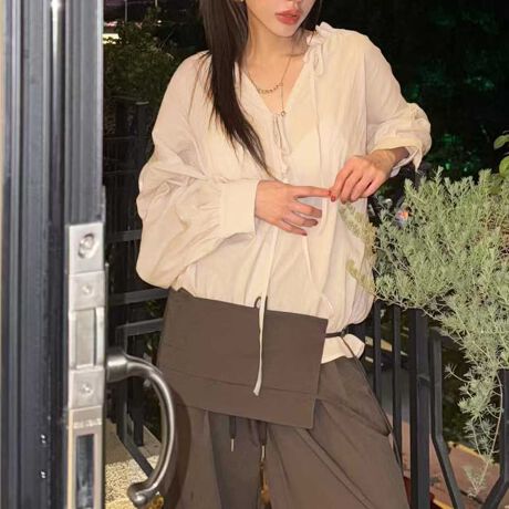 首元の開きは控えめで、リボンを結ぶことで上品な印象に。