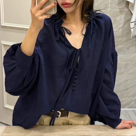 襟元にフリルをあしらい、リボンタイで仕上げた長袖ブラウスです。
