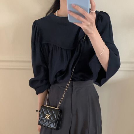 リボンタイ×ギャザー袖ブラウス
