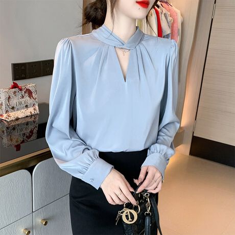 襟元にプリーツを施したキーネックデザインの長袖ブラウスです。
