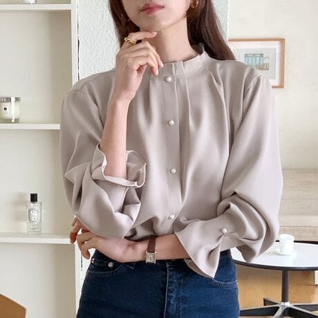 プリーツ入りのハイネックが印象的な長袖ブラウスです。