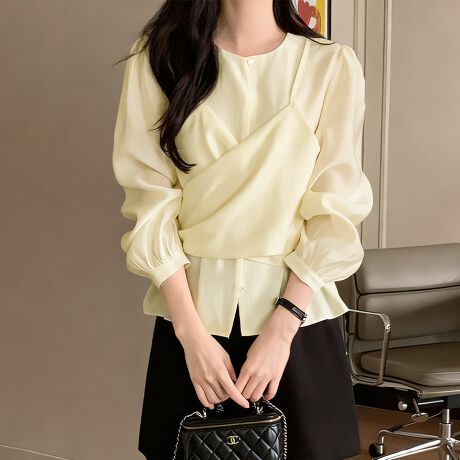ラップ風のデザインが特徴的な長袖ブラウスです。