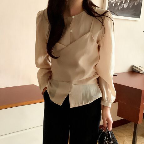 ラップ風のデザインが特徴的な長袖ブラウスです。