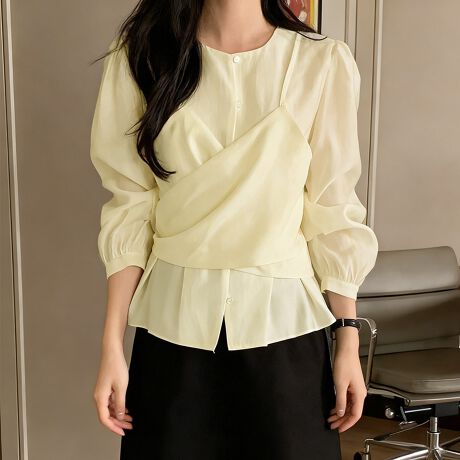 ラップ風のデザインが特徴的な長袖ブラウスです。
