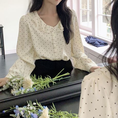 ドット柄フリルネックブラウス
