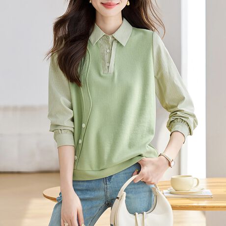 シャツを重ね着したようなレイヤード風デザインの長袖トップスです。