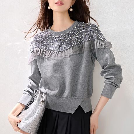 肩から胸元にかけてフリルとスパンコールが施された長袖スウェットです。