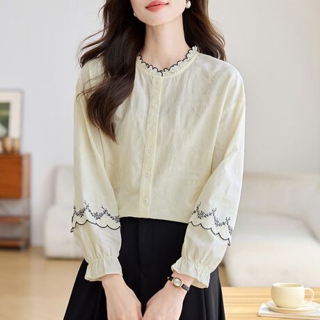 襟元はスカラップ仕上げのフリルデザインで、顔まわりを華やかに演出。