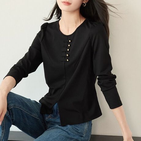 フロントにゴールドボタンをあしらった長袖トップスです。