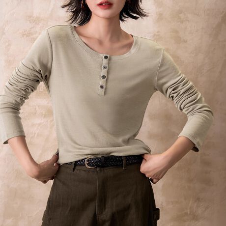 襟元はクルーネックベースにボタン付きのヘンリーデザインで、顔まわりに程よいアクセントをプラス。
